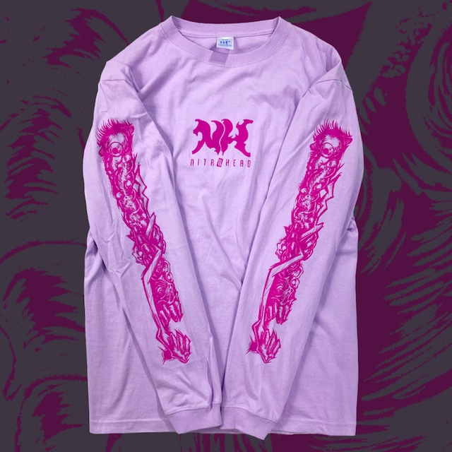 ダークテイストのグラフィック「Abyss」を両袖に大きくプリント。フロントはセンターにワンポイント。 Front design:撃ち抜かれたDistortion NH Sleeve design : Abyss Print color:パープル 【サイズ規格】 着丈 L:73cm / XL:77cm 身幅 L:55cm / XL:58cm 袖丈 L:63cm / XL:64cm