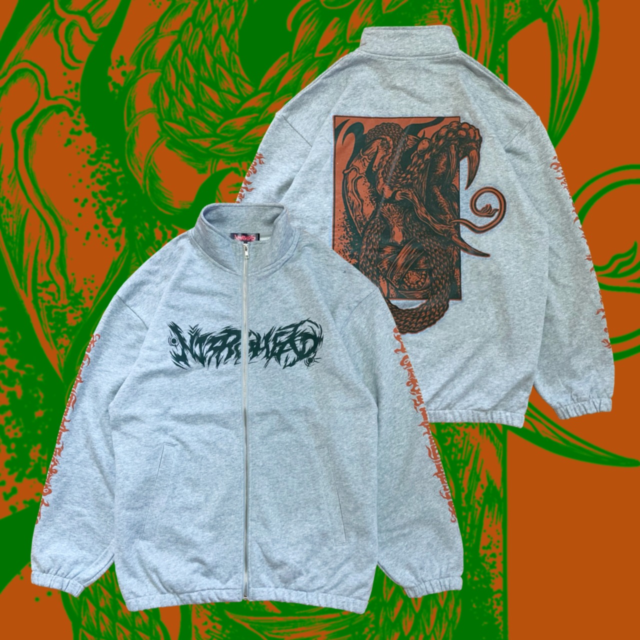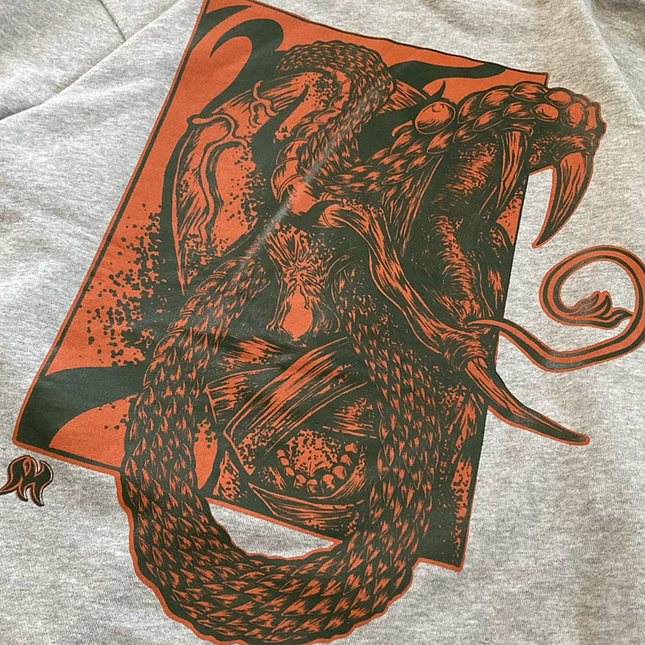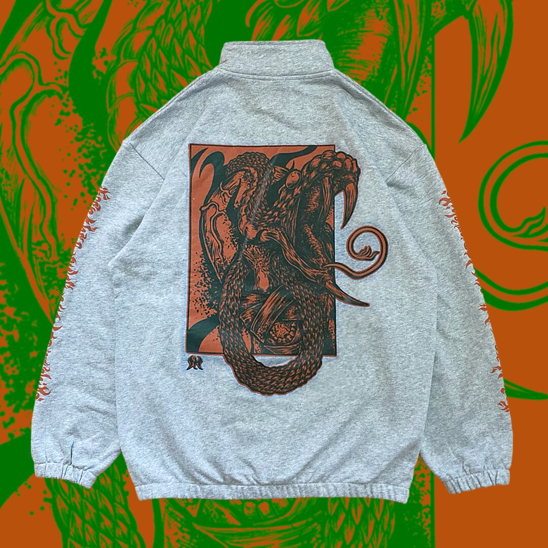 バックにメイングラフィックとなる「蛇魂(Jakon)」、フロントはジップを跨いでブランドロゴをプリントしたフルジップスウェットジャケット。袖のモッタリ感と、裾のキュッと感が良い感じです。朝ズバッ!ジップまたぎ!!!!!
