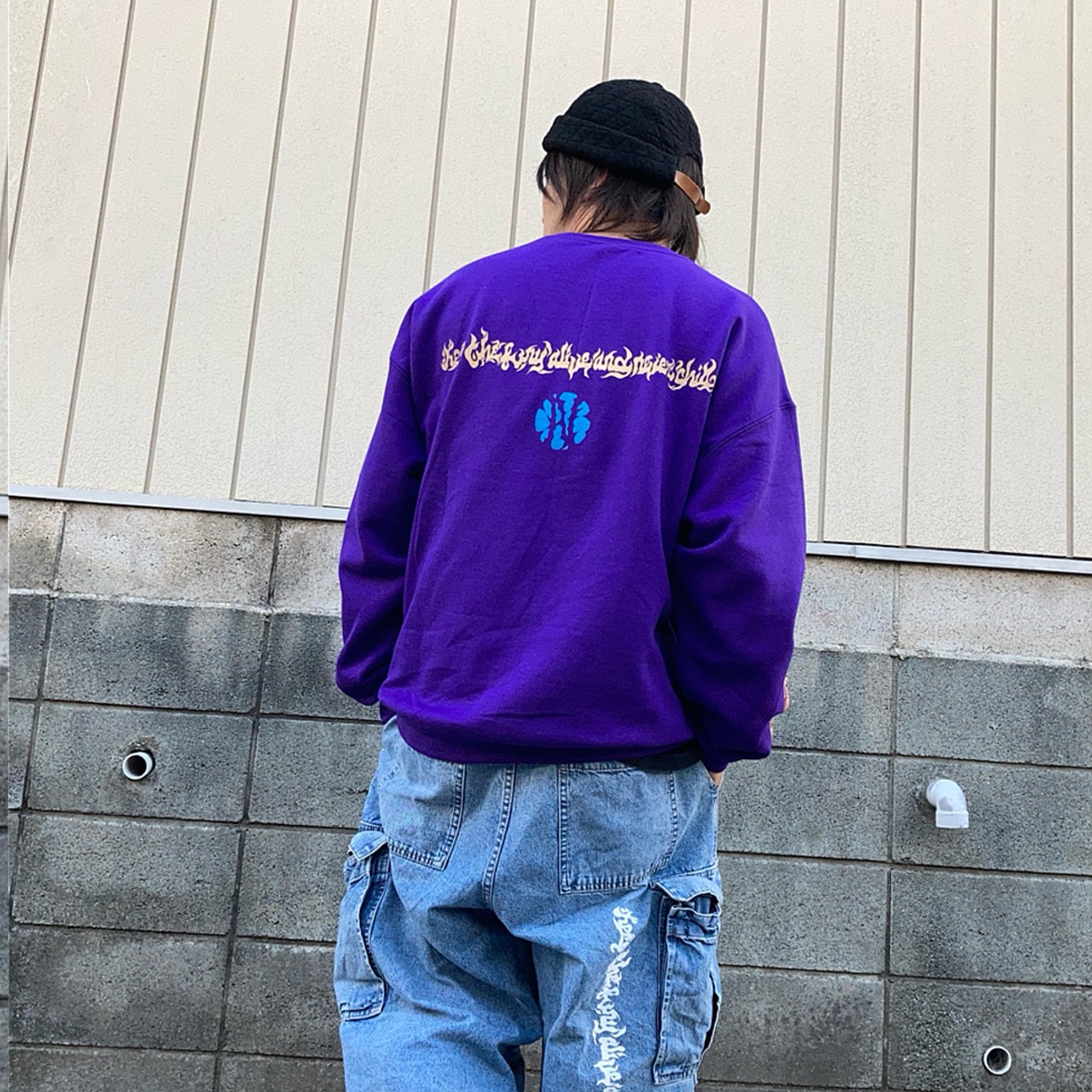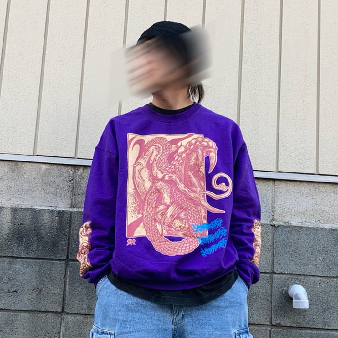 フロントのThe Nagaを筆頭に、各所にプリントを配したクルーネック。手刷りらしいプリントで勝負してます。