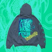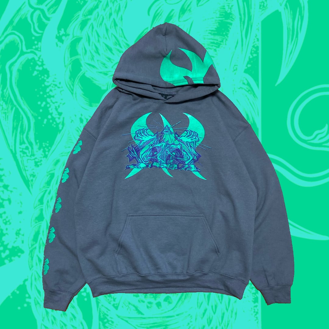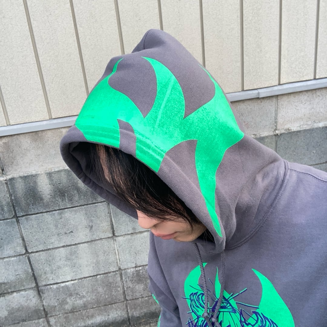フロントのThe Nagaを筆頭に、各所にプリントを配したパーカー。手刷りらしいプリントで勝負してます。フード部分のプリント頑張りました。