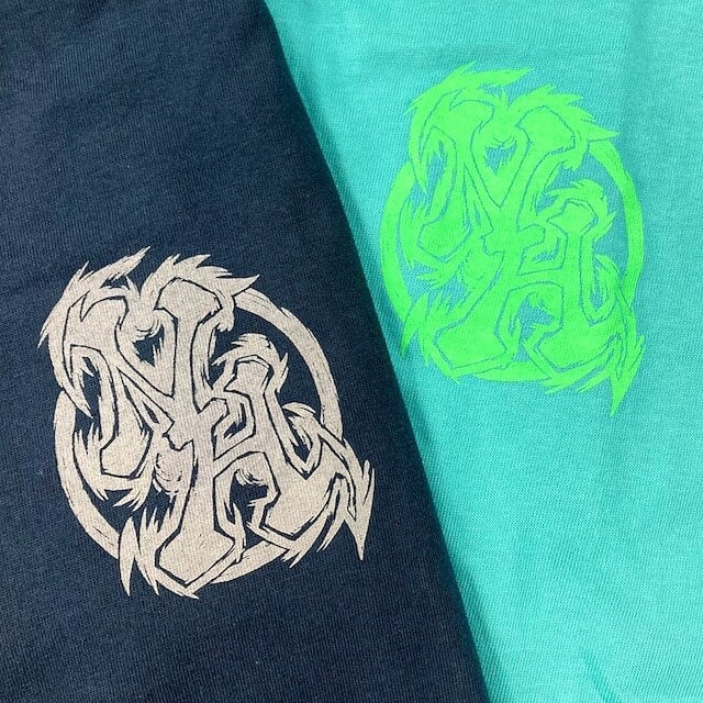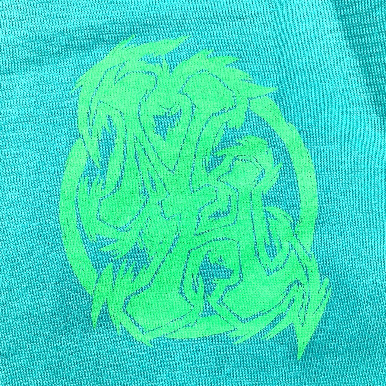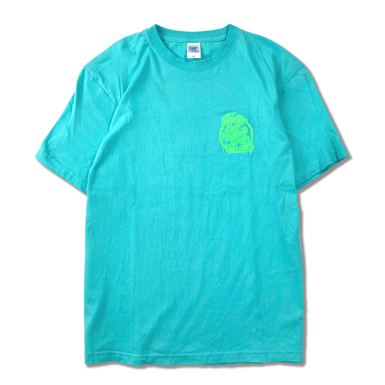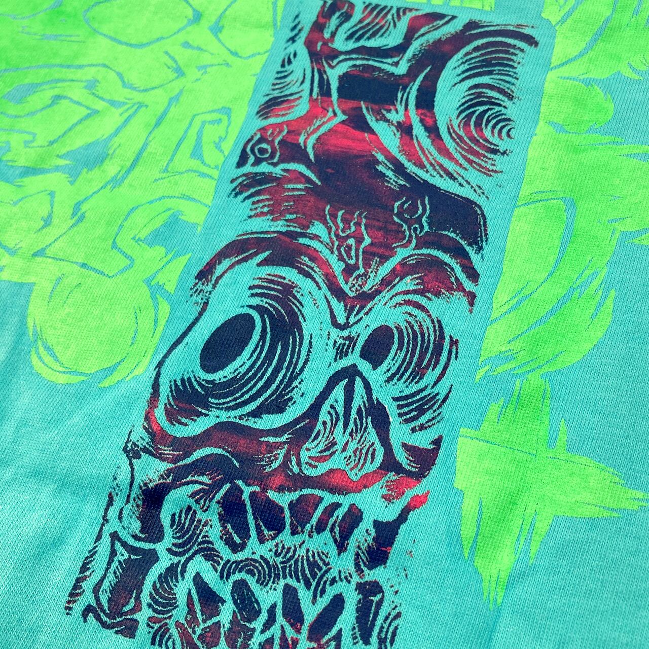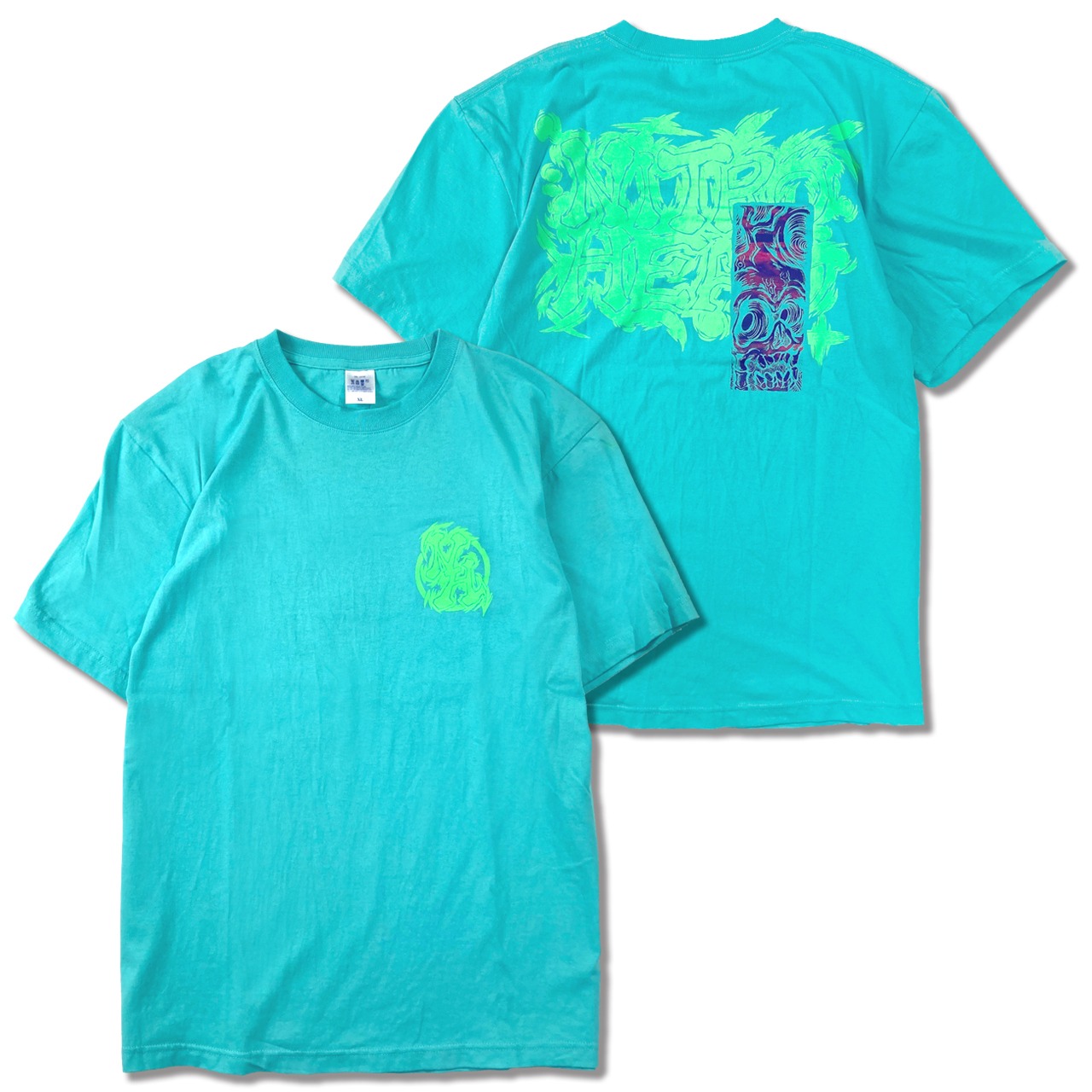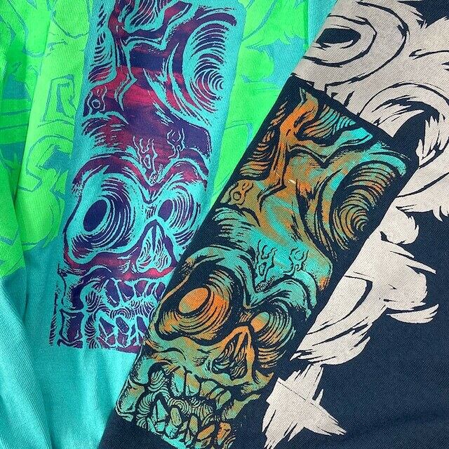 フロントはRound Blast Logo、バックにはBlast Logoに酷烈骸骨をマルチカラーでプリント。ロゴにあえてスペースを作り、そこに絵を入れ込むというアイデアは、何かしら捻りを加えないと気が済まない表現者の性格を体現している。バックの酷烈骸顔は色の混ざり具合が一点ごとに異なる、手刷りならではの味を味わえる逸品。