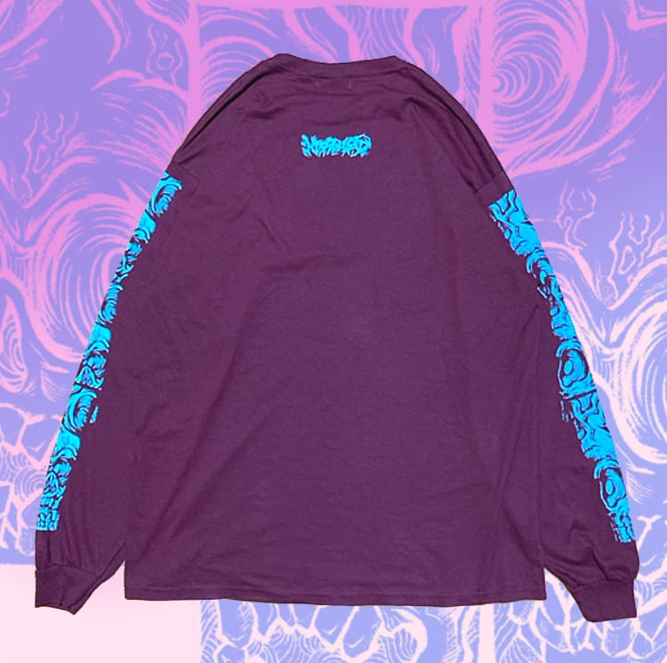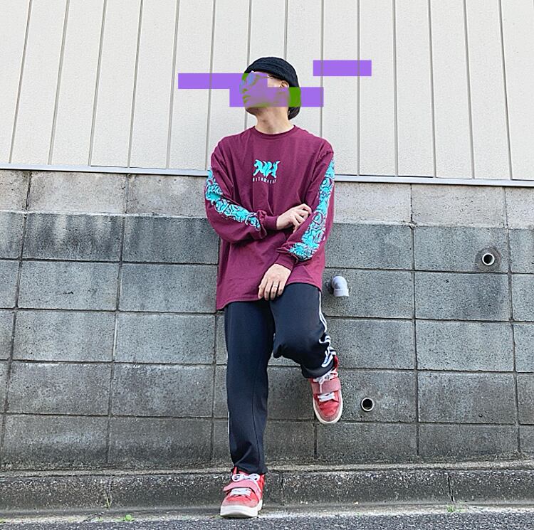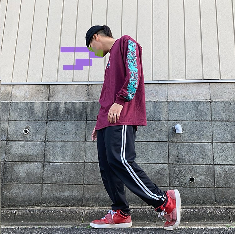 ハードコアグラフィック"酷烈"を両袖にプリント。手刷りならではのチャレンジングなアプローチが光るロンT。