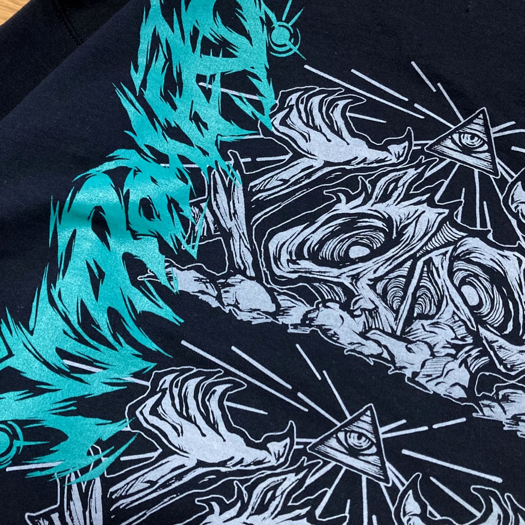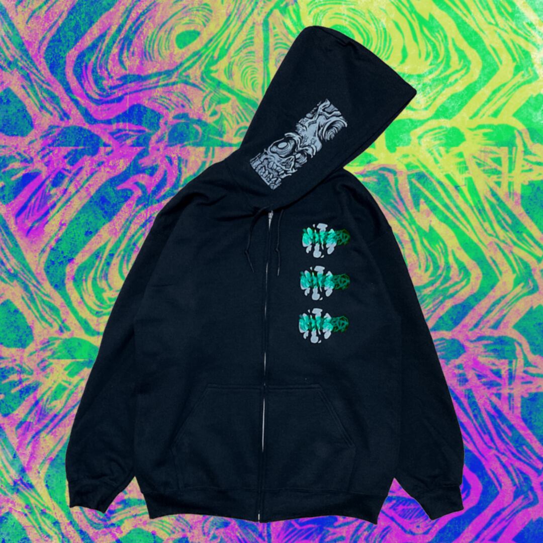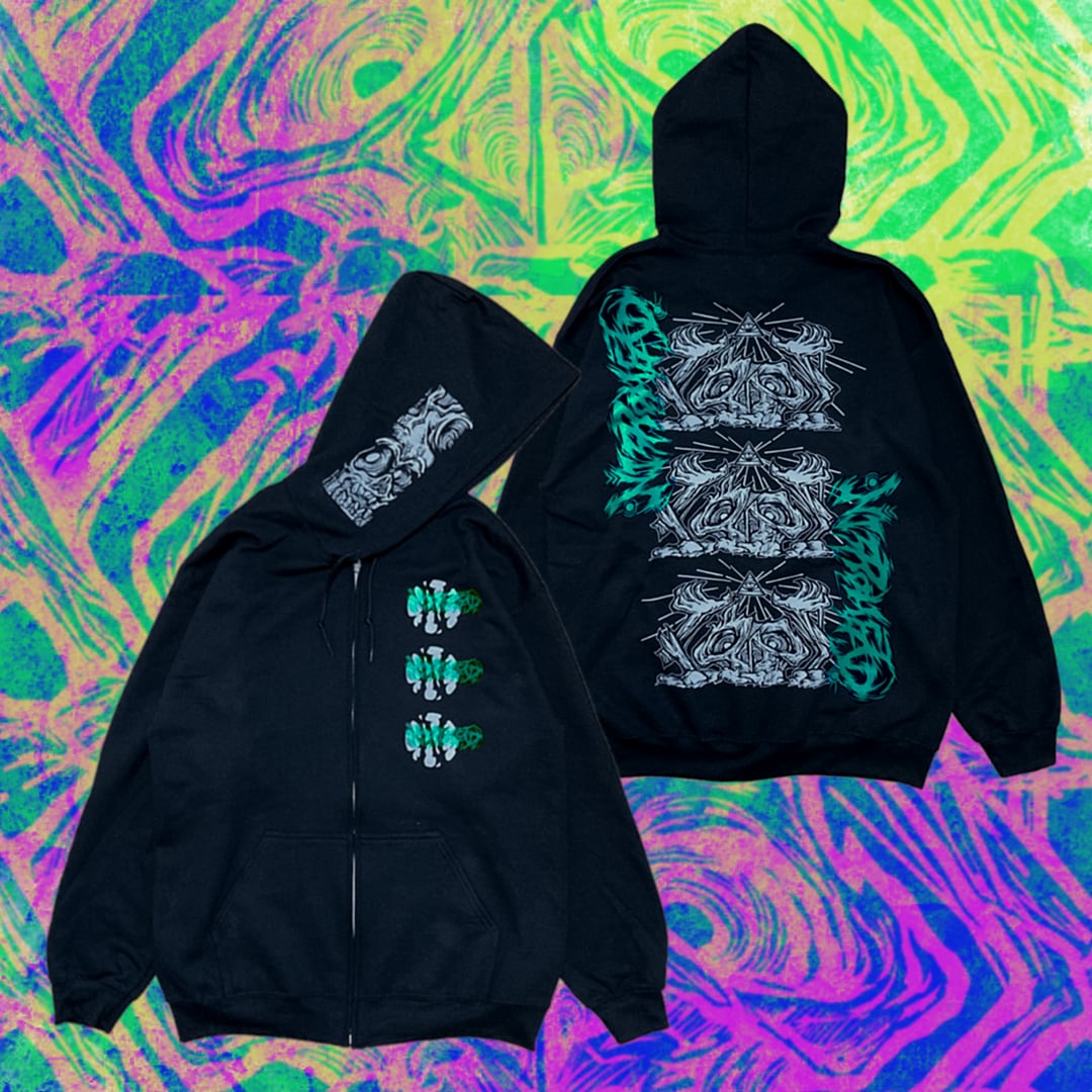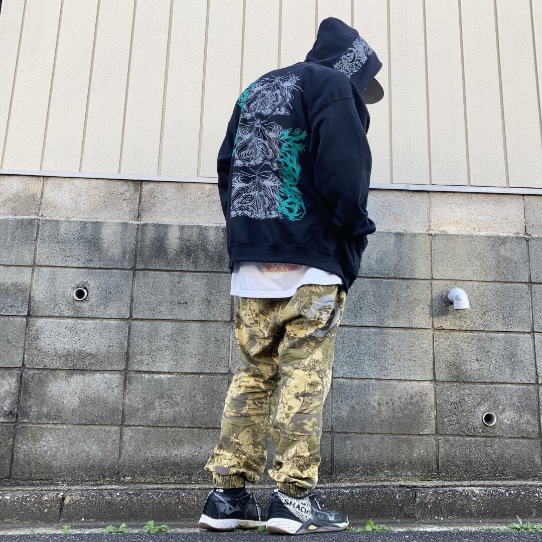 ハードコアグラフィック「Invisible」を軸にマルチプリントを施したジップパーカー。フードにもお馴染みのKOKURETSUをプリント。薄手で羽織りやすくもしっかり裏起毛。