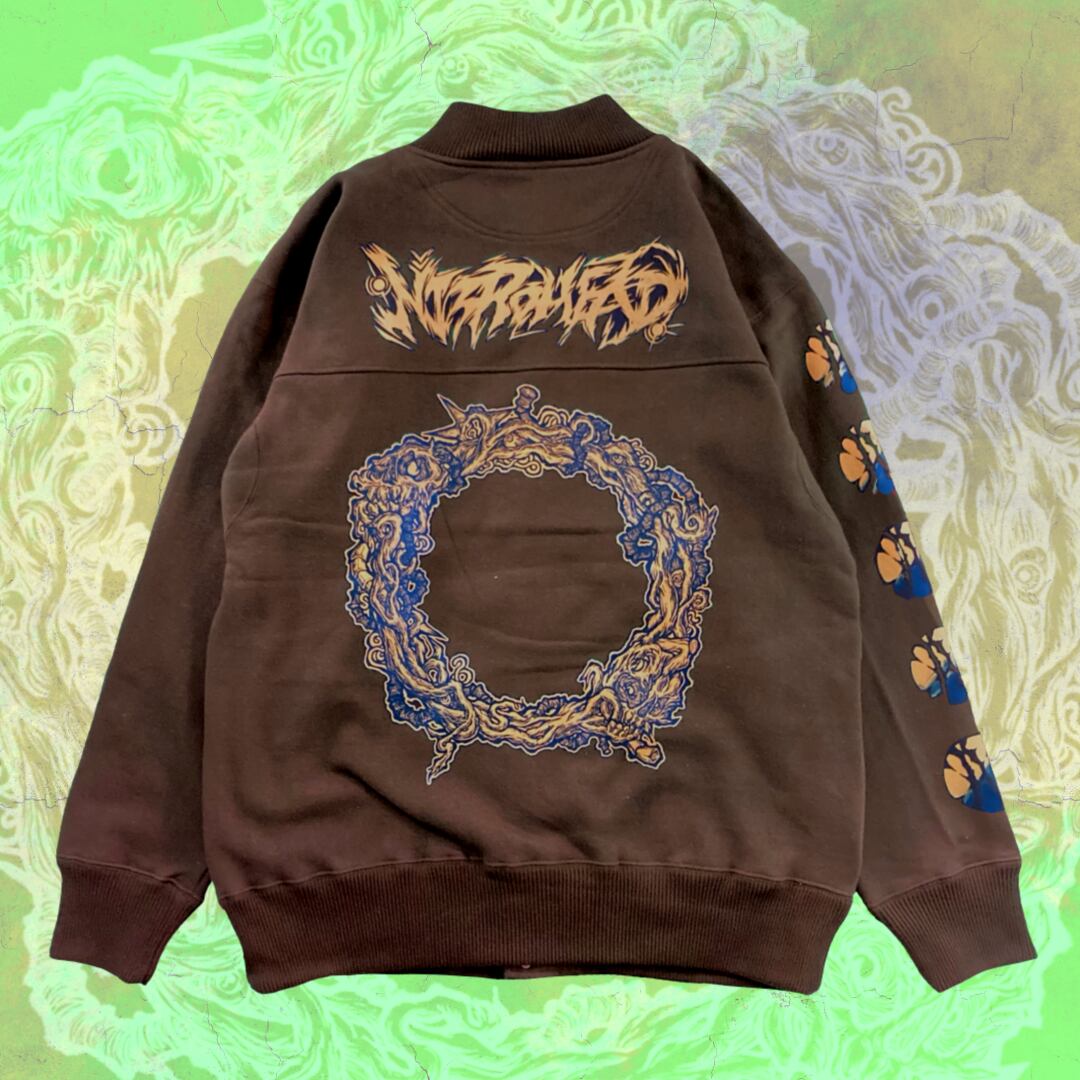 ハードコアグラフィック「Samsara」をバックに配したブルゾン型ヘビーウェイトスウェットJKT。また片袖の5連Round Logoは手刷りでグラデーションを表現。一つ一つ風味の違う仕上がり。