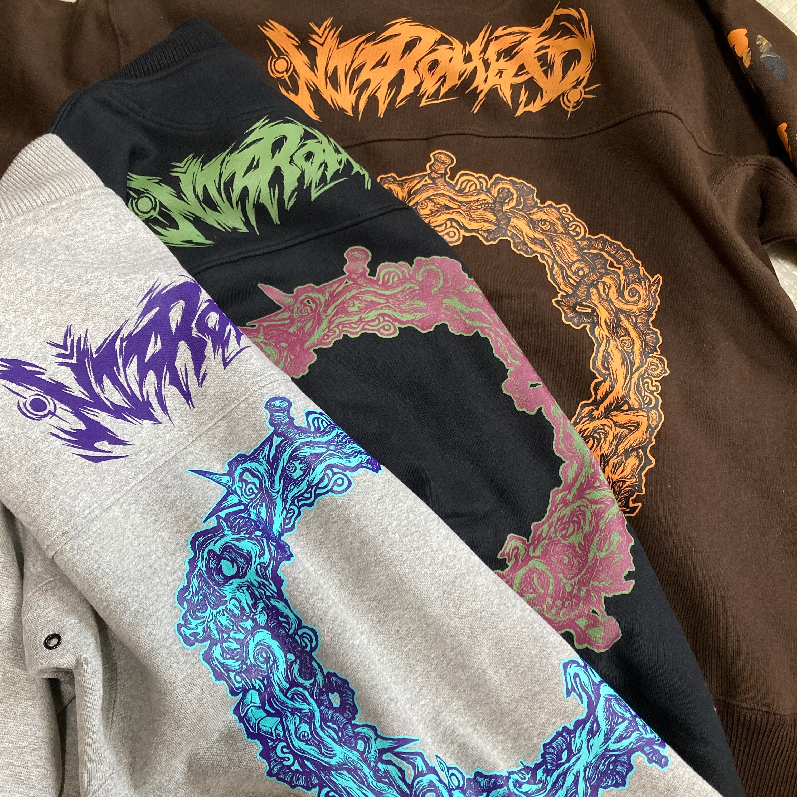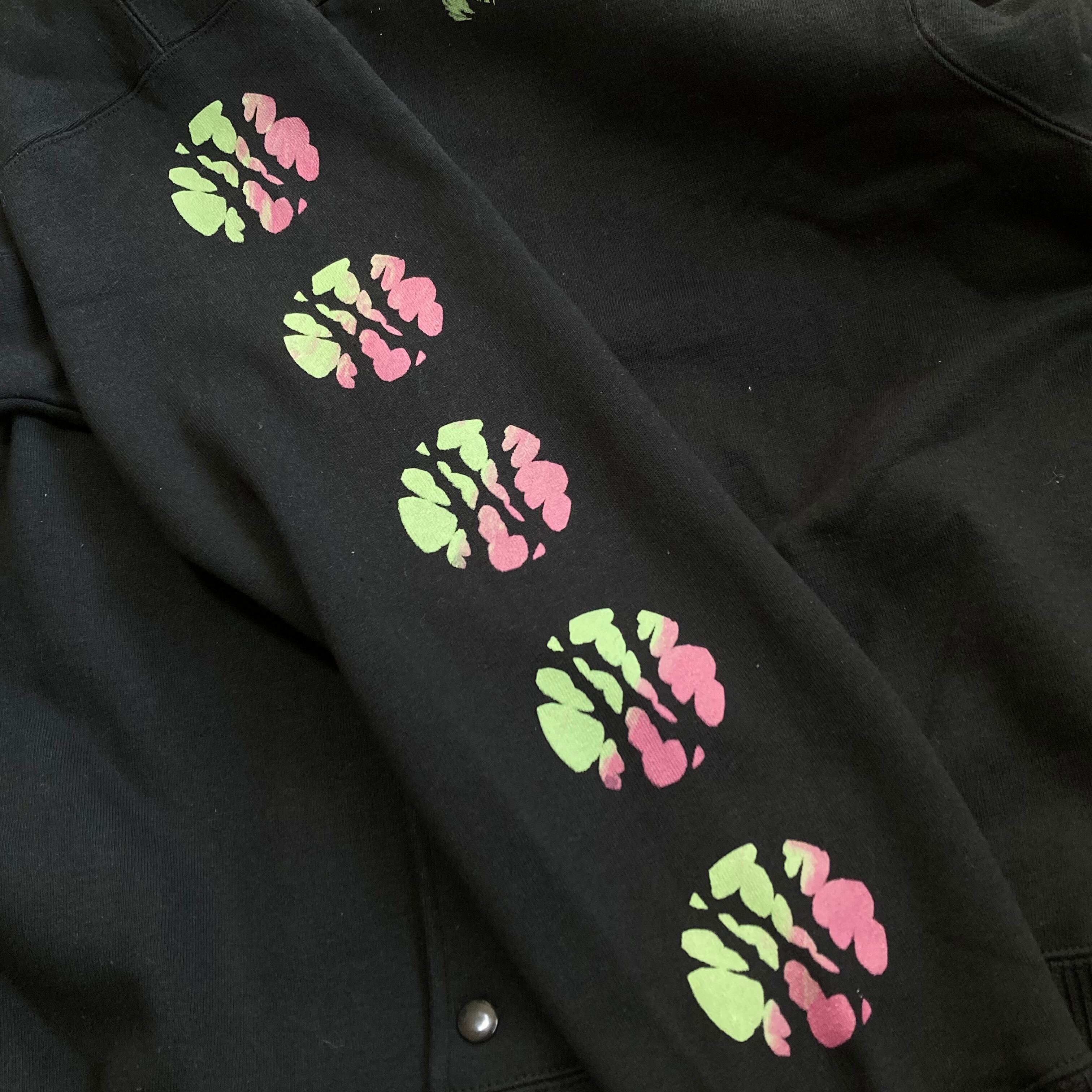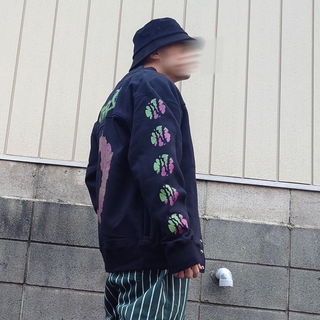 ハードコアグラフィック「Samsara」をバックに配したブルゾン型ヘビーウェイトスウェットJKT。また片袖の5連Round Logoは手刷りでグラデーションを表現。一つ一つ風味の違う仕上がり。