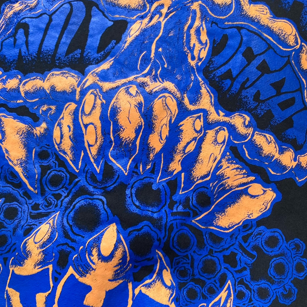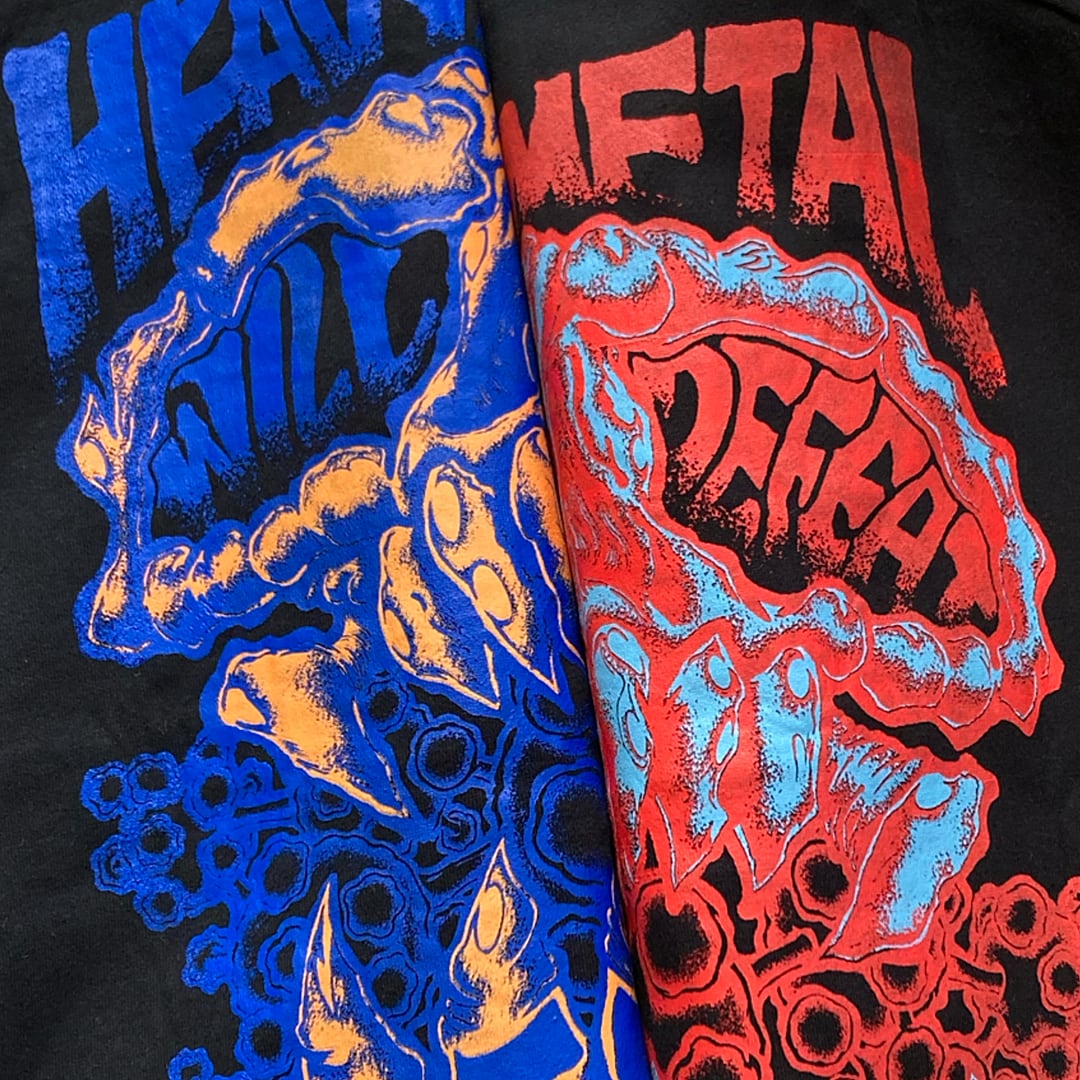ハードコアグラフィック「Heavy metal will defeat the cancer」をバック、両袖にプリント。フロントは無しという、敢えての強気スタイル。