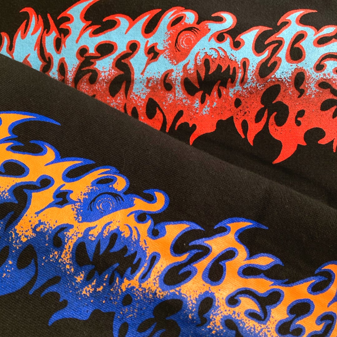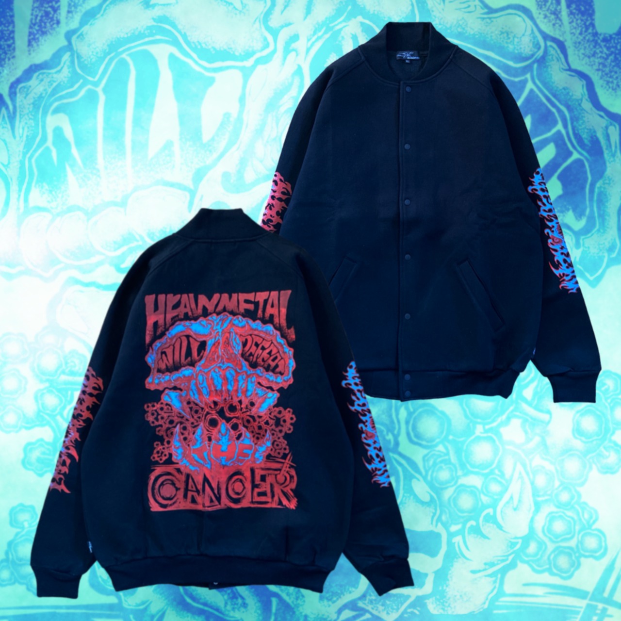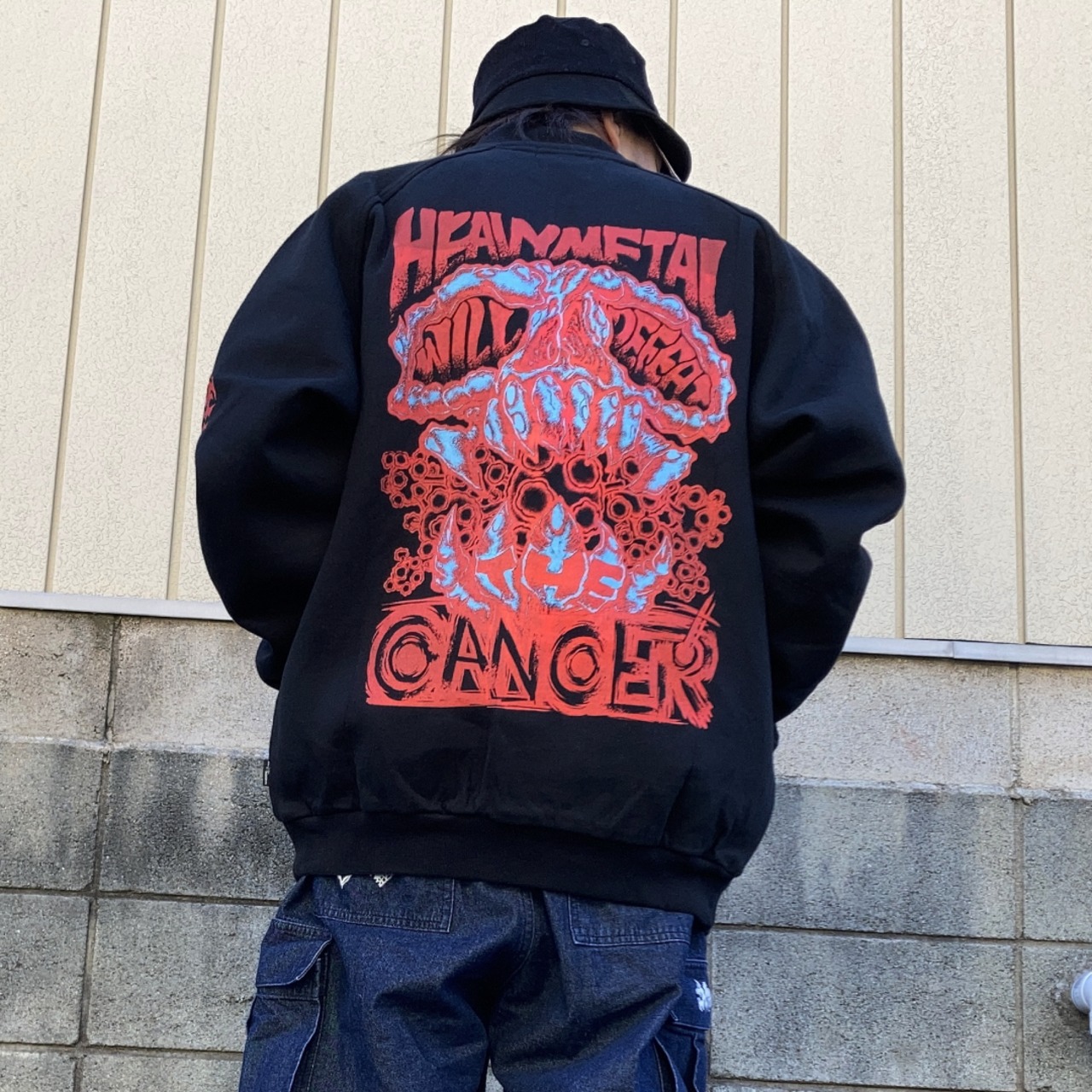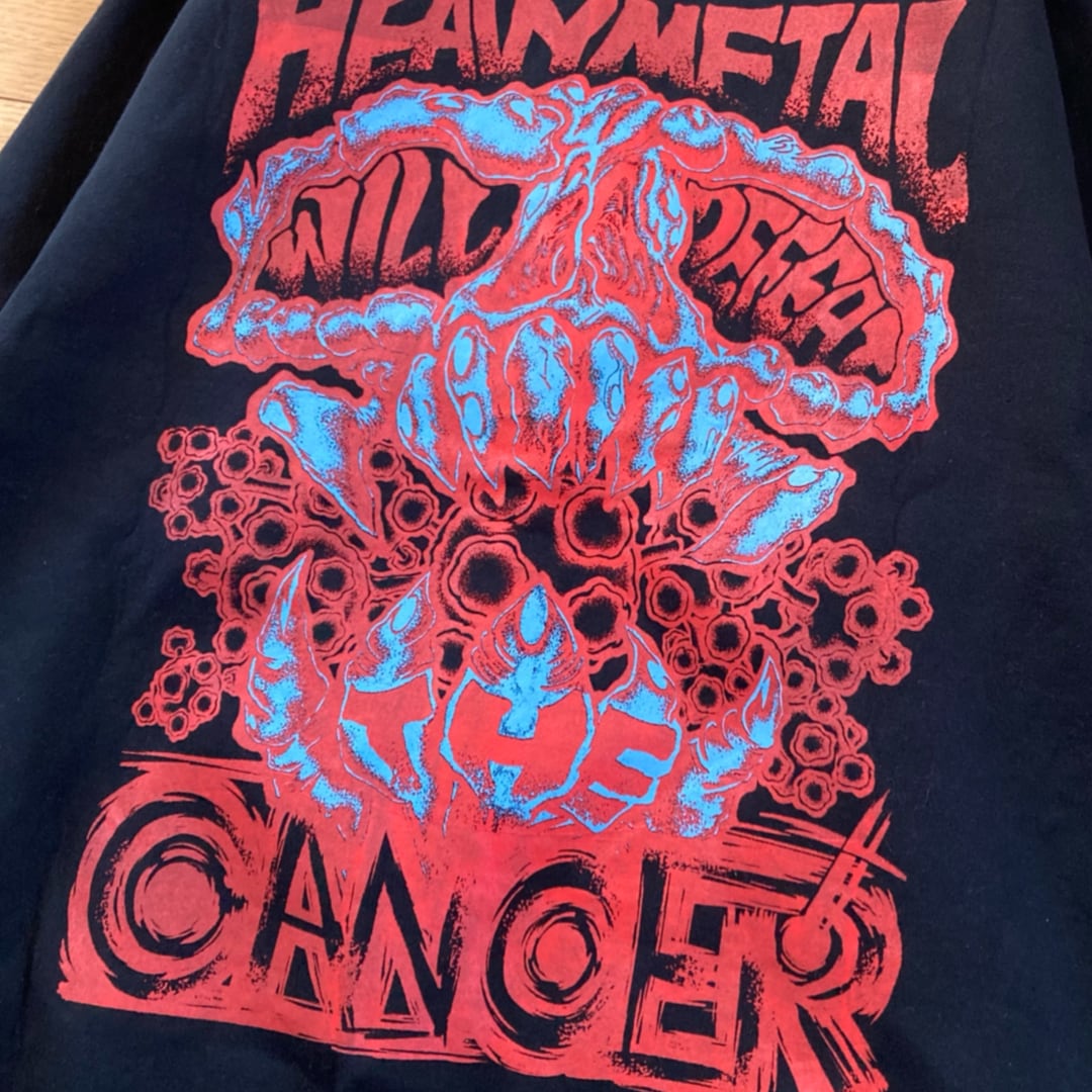 ハードコアグラフィック「Heavy metal will defeat the cancer」をバック、両袖にプリント。フロントは無しという、敢えての強気スタイル。
